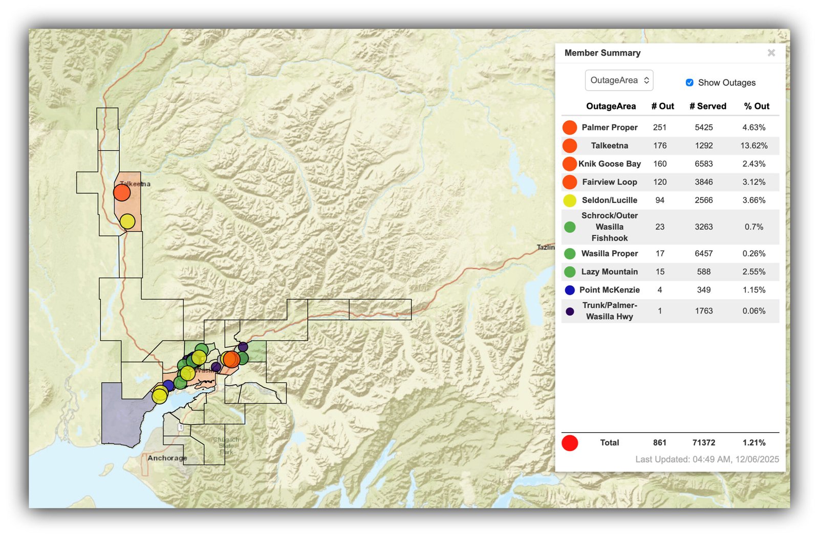 Current power outages across the Mat-Su region as tracked by Matanuska Electric Association. Photo courtesy of Matanuska Electric Association. By…