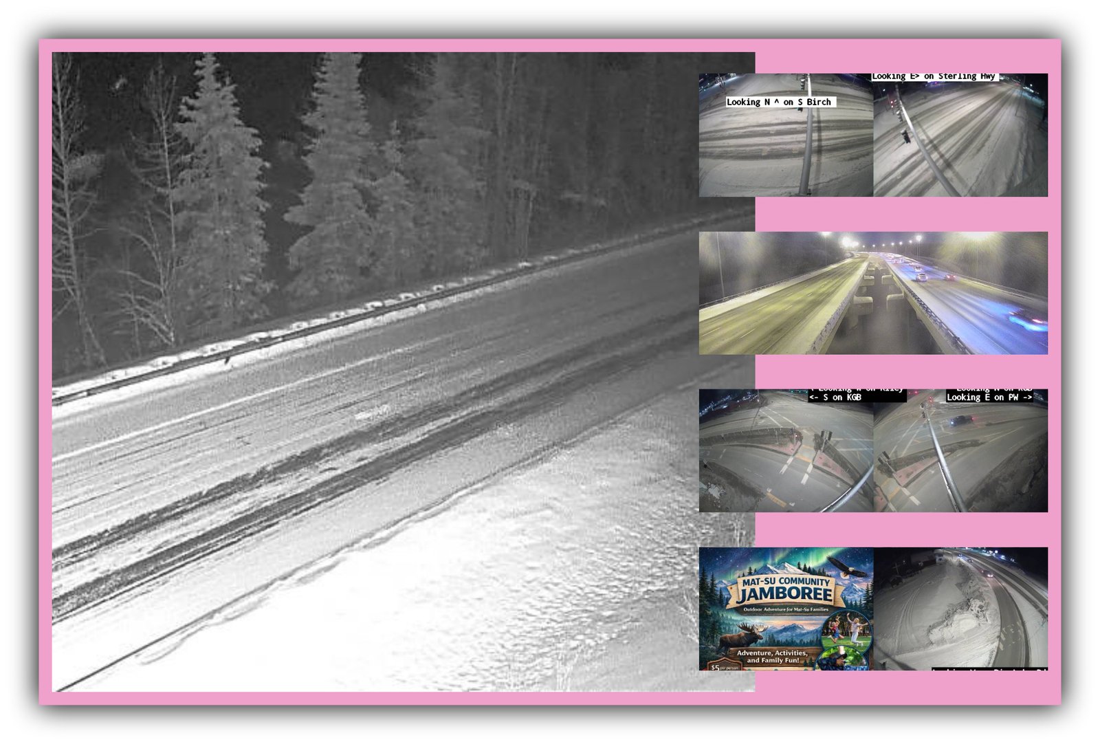 Traffic cameras from the Alaska Department of Transportation & Public Facilities show conditions Thursday morning along the Seward Highway at Bird Point, Portage, Turnagain…