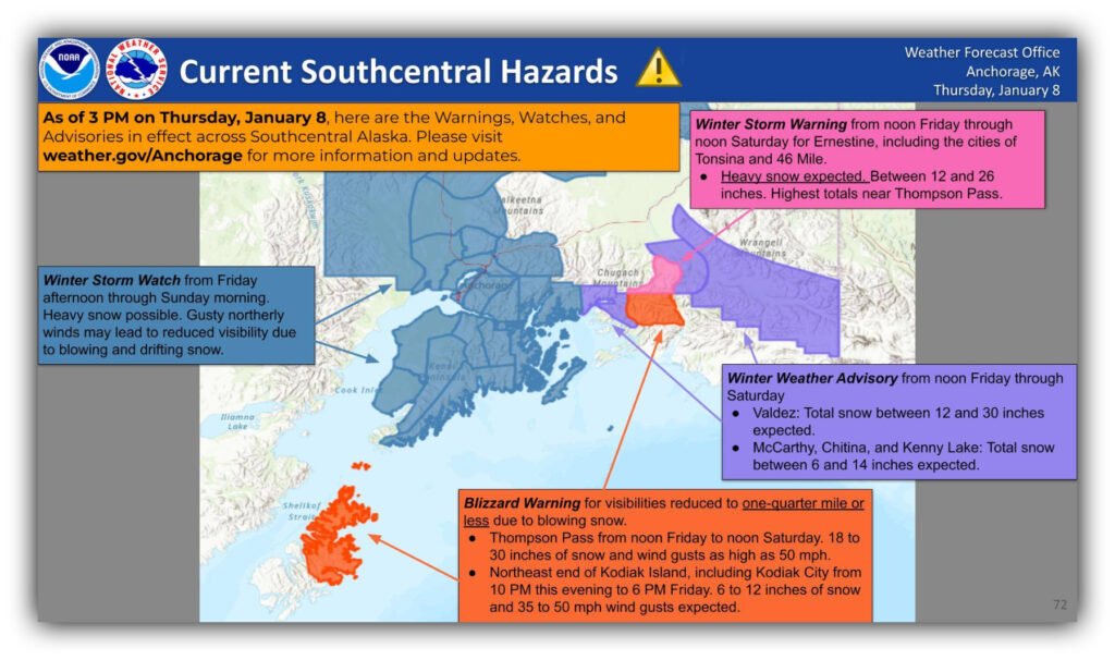 | Evening | 0°F to 10°F | Snow showers continue. It’s Alaska. You wanted beauty, you got blackout white. |