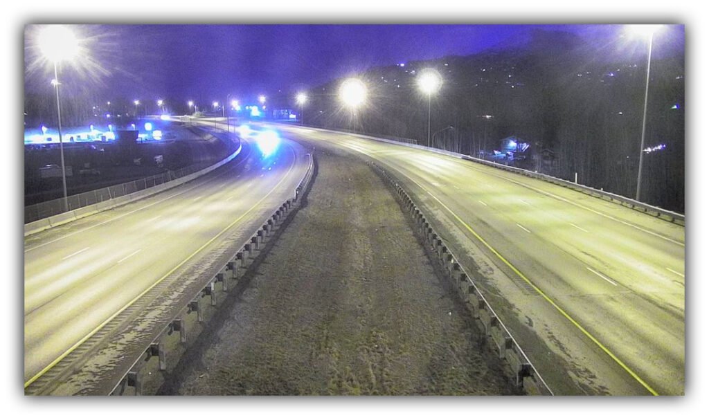 Traffic: Heavy at Glenn Highway bridge squeeze (tight lanes, reduced speeds, steady congestion)