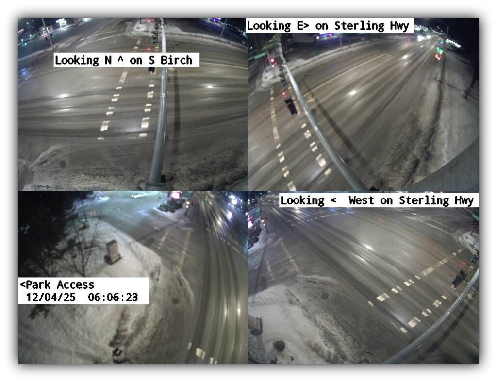 The stretch from Soldotna up toward Cooper Landing is seeing slush in turn lanes and pockets of freezing fog near the hills. Shoulders are slick and narrow in places where plows piled snow. Ice may lurk where slush refreezes, especially at night.