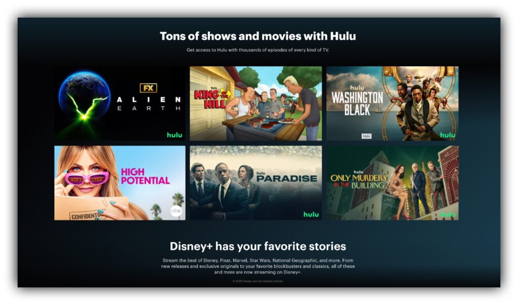 - Includes: Full access to Disney+ content (Disney, Pixar, Star Wars, MCU, family-friendly fare) plus Hulu’s library (originals, network series, reality TV).