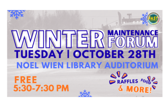 FAST Planning is hosting a Winter Maintenance Forum to discuss strategies and plans for the upcoming winter season. The forum is scheduled for today, October 28, 2025, from 5:30 p.m. to 7:30 p.m. AKST, and will be held in Fairbanks. FAST Planning