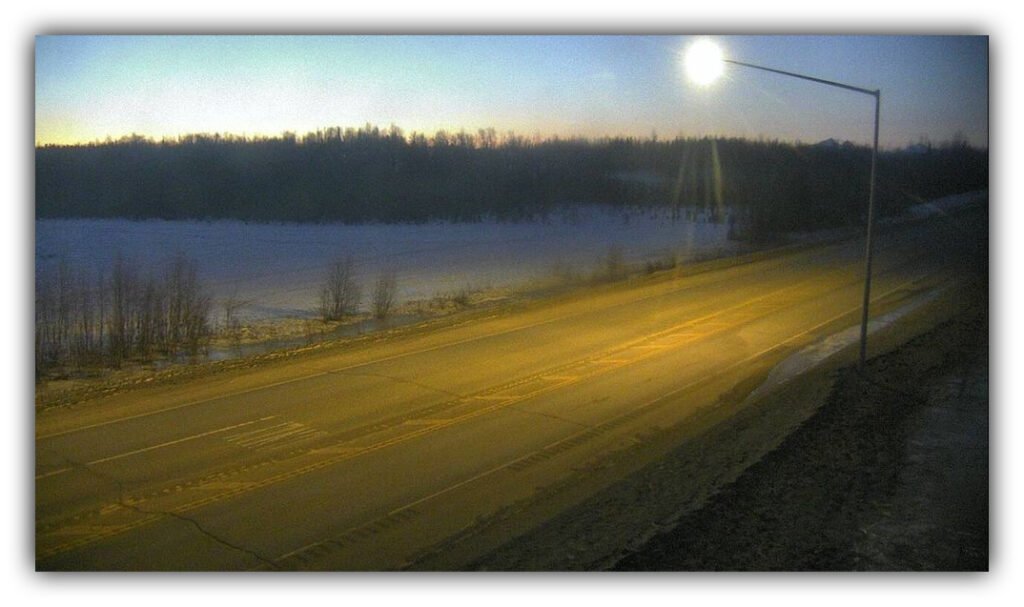 Bright sunset glare westbound toward Anchorage🟡 Moderate