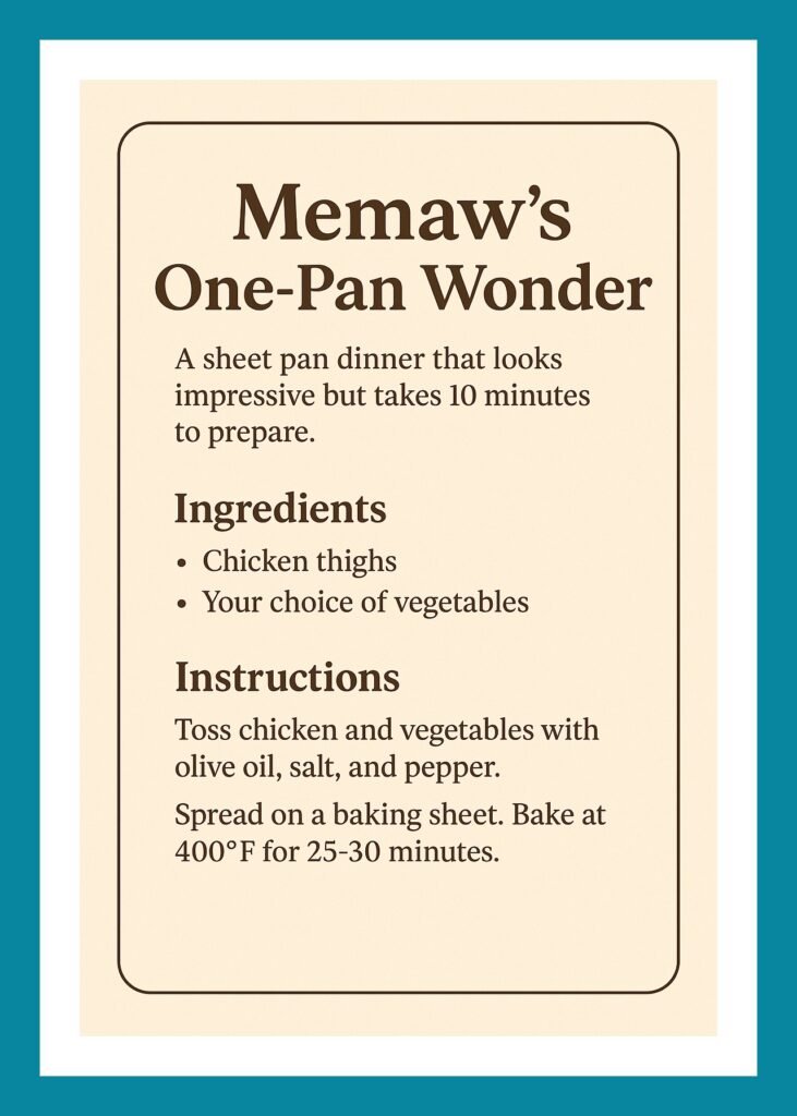 - A âone-pan wonder.â Toss some chicken and whatever vegetables are still clinging to life in your fridge onto a baking sheet. Olive oil, salt, and attitude. Bake at 400°F until it smells like effort.