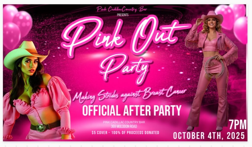 - End it with passion: Doors open atĀ 7:00 PMĀ for a night of country beats, signature cocktails, and pink Cadillac vibes. Cover is justĀ $5, with 100% donated to Making Strides Against Breast Cancer.
