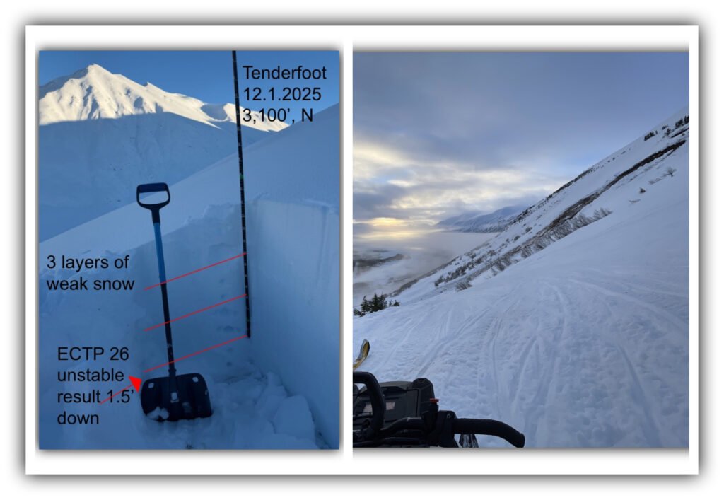 Meg from the Chugach National Forest Avalanche Center explains the snow conditions at Pastoral Valley at 3,400 feet on a northeast-facing slope, with Taylor Pass visible behind her, on December 7, 2025. Credit: Chugach National Forest Avalanche Center