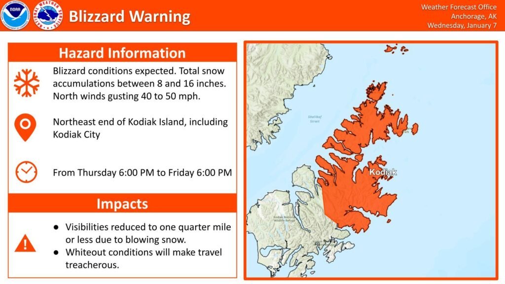 Conditions grow more dangerous as you move away from Southcentral. A Blizzard Warning is in effect for the northeast end of Kodiak Island, including Kodiak City, where heavy snow, strong winds, and near whiteout conditions are expected. Across Southwest Alaska and the Bering Sea, multiple warnings and advisories are in place for snow, wind, and extreme cold, stretching across the Kuskokwim Delta and Bristol Bay regions.