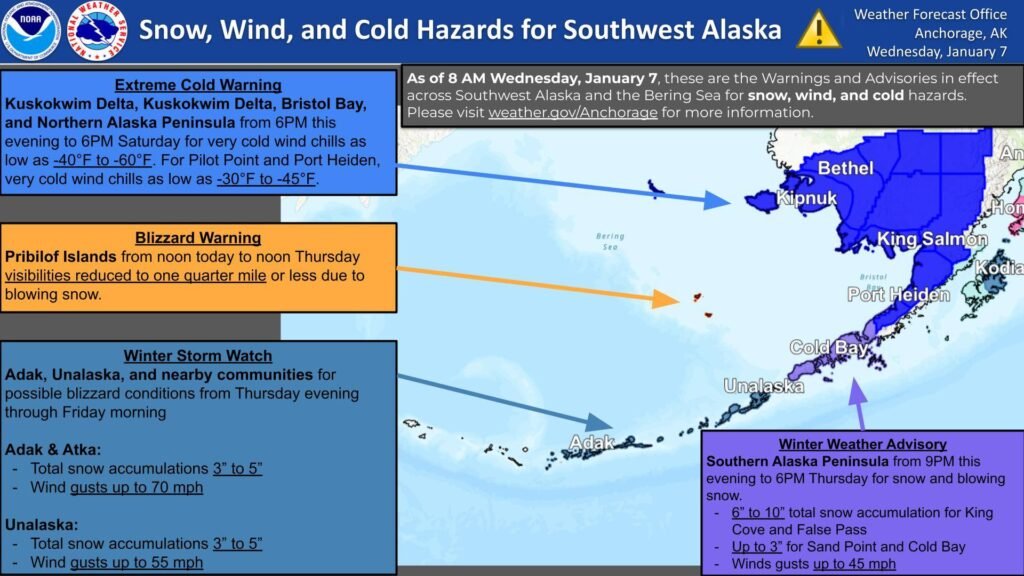 The cold is especially severe along the Northern Alaska Peninsula. From this evening through Saturday, wind chills could plunge as low as minus 40 to minus 60 degrees in some locations. Communities such as Pilot Point and Port Heiden are bracing for dangerous wind chills ranging from minus 30 to minus 45 degrees.