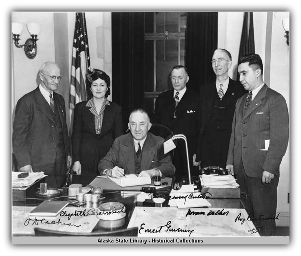 Elizabeth Peratrovich (standing, left) looks on as Ernest Gruening signs the Anti-Discrimination Act of 1945 into law, one of the earliest civil rights measures in the United States. Witnesses, left to right, are O. D. Cochran, Elizabeth Peratrovich, Edward Anderson, Norman Walker, and Roy Peratrovich. Image: Amy Lou Blood, Ordway’s. Credit: Alaska State Library, Historical Collections.