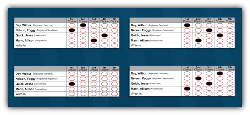 Under Alaska’s system, voters rank candidates in order of preference. If no one wins a majority of first choice votes, the candidate with the fewest votes is eliminated. Ballots for that candidate are redistributed based on the next ranked choice. The process continues until someone secures more than 50 percent of active ballots.