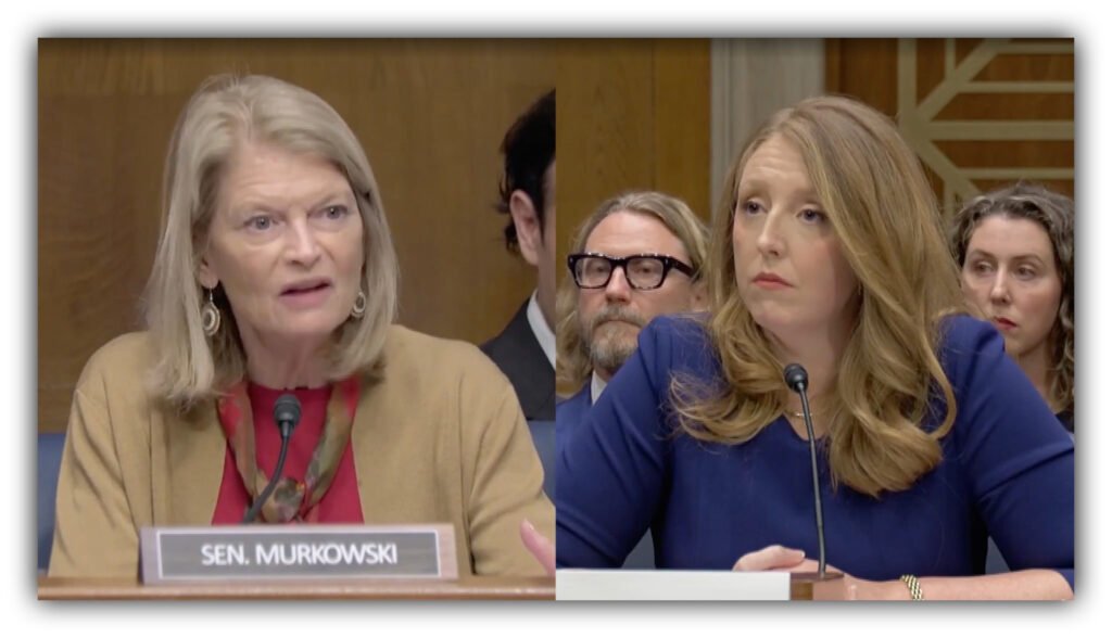 Feb. 25, 2026, Washington, D.C. – Surgeon General nominee Casey Means listens as Lisa Murkowski emphasizes the impact of childhood Hepatitis B vaccination efforts in Alaska during a Senate hearing. Photo courtesy Yahoo News.