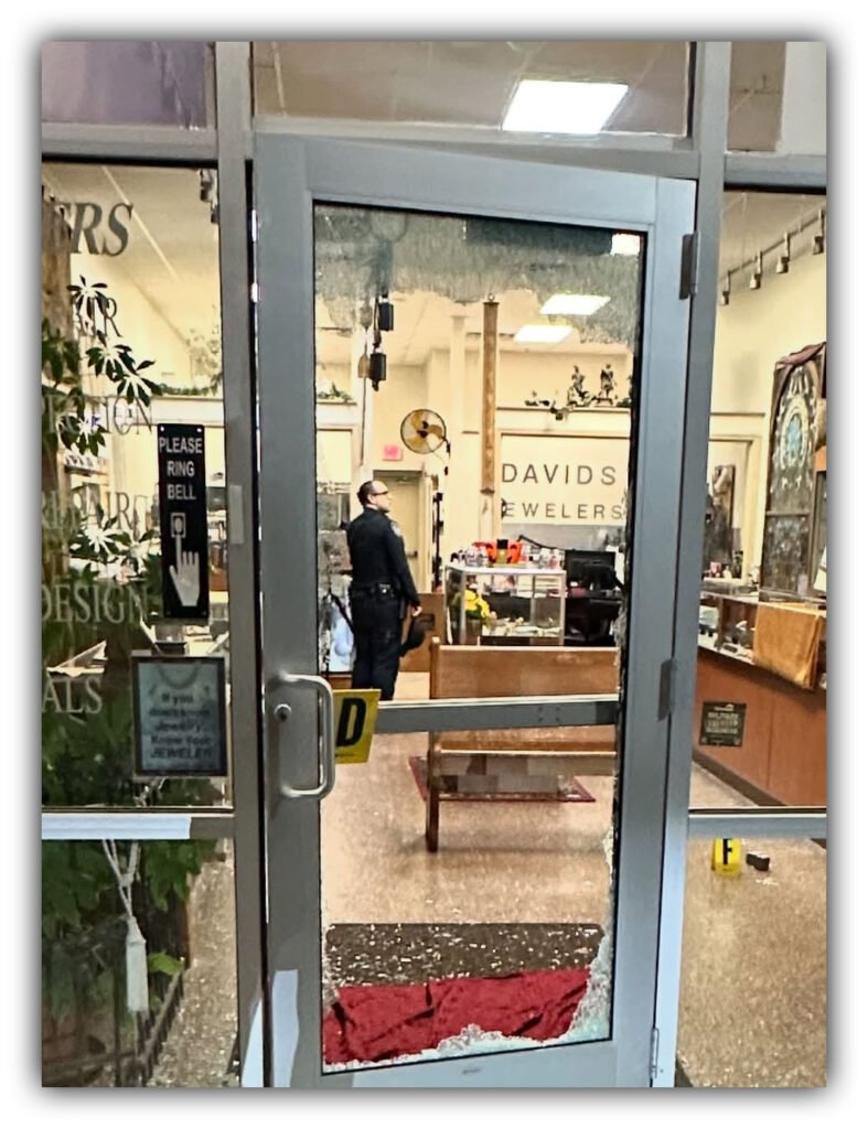 Inside David’s Jewelers. A look at the showroom following the overnight break‑in that damaged display cases and the front door. Photo courtesy of David’s Jewelers.