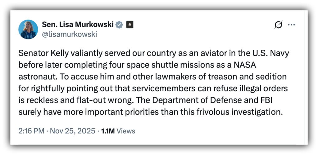 Alaska Senator Lisa Murkowski spoke out on X (formerly Twitter) defending Senator Mark Kelly, a former U.S. Navy aviator and NASA astronaut, against recent treason and sedition allegations. In her post, Murkowski described accusations that Kelly and other lawmakers committed wrongdoing for pointing out that servicemembers can refuse illegal orders as ârecklessâ and âflat-out wrong.â She added that federal agencies such as the Department of Defense and FBI have more pressing priorities than pursuing what she called a âfrivolous investigation.â