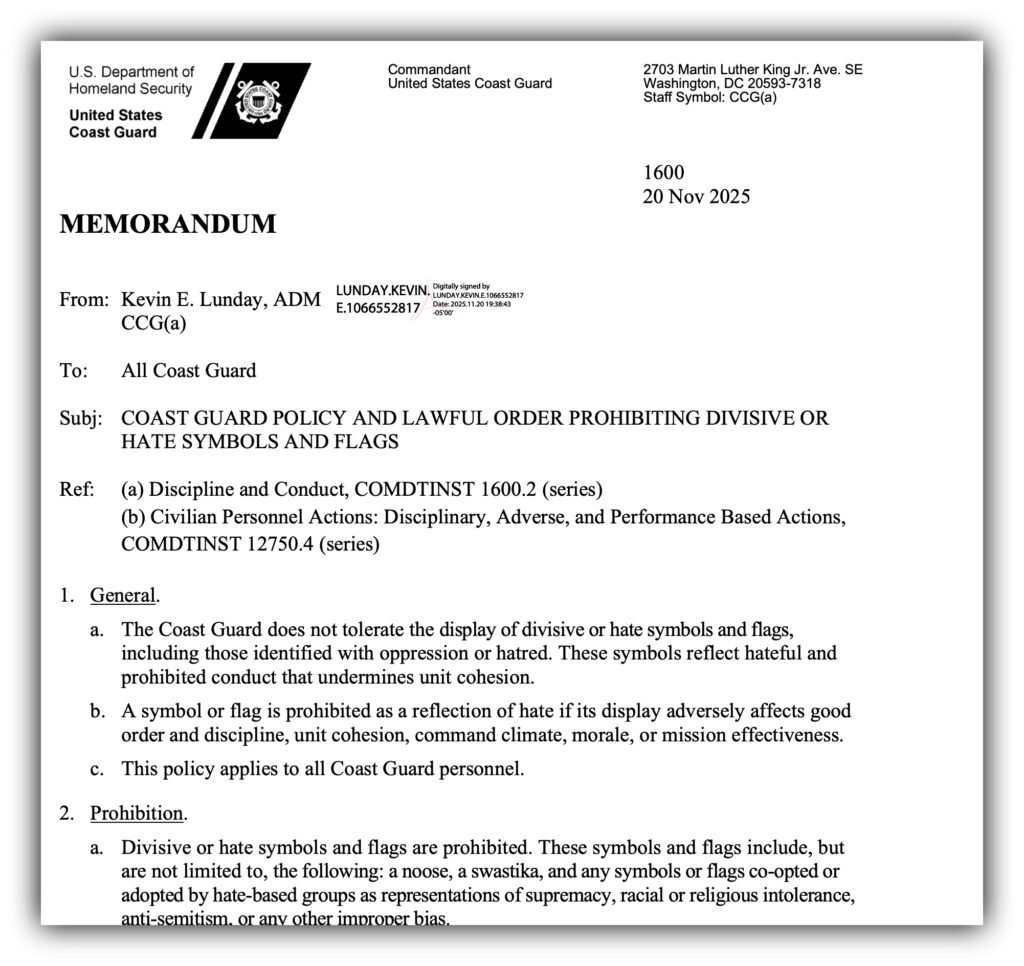 The U.S. Coast Guard issues a formal policy and lawful order reaffirming its strict prohibition on divisive or hate symbols across all workplaces, facilities, and assets. The order, aimed at maintaining unit cohesion, morale, and mission effectiveness, explicitly bans symbols including swastikas, nooses, Confederate imagery, and any imagery associated with hate-based groups.