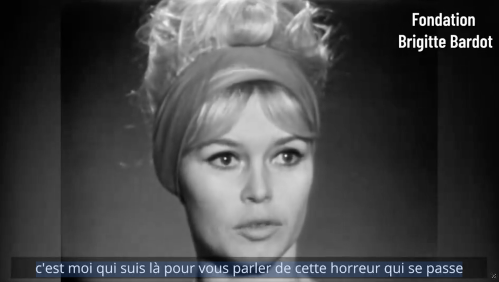 Brigitte Bardot in a screenshot from a memorial video shared by the Fondation Brigitte Bardot on Instagram, in which a young Bardot speaks to the press in French saying “It is I who am here to tell you about this horrific event that is taking place.” Photo via Fondation Brigitte Bardot Instagram.
