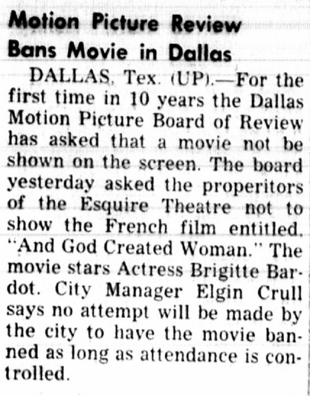 1958 newspaper clipping from The Ennis Daily News shows Dallas authorities asking that And God Created Woman, starring Brigitte Bardot, not be shown at the Esquire Theatre over content concerns. Screenings were allowed under controlled attendance. Public domain.