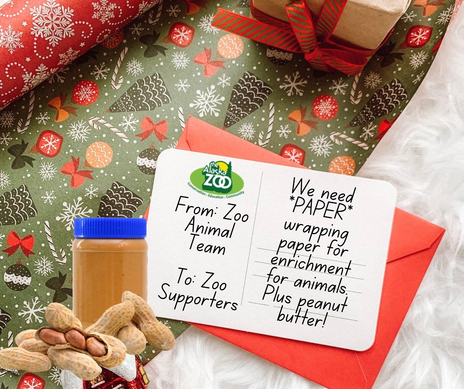 The Alaska Zoo is asking the public to donate paper wrapping paper and peanut butter for animal enrichment and cold-weather treats. Donations can be dropped off at the zoo’s admissions building daily from 10 a.m. to 4 p.m. Zoo Lights runs one final evening from 5 p.m. to 8 p.m. before pausing until Valentine’s weekend.