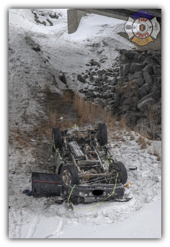 Photos shared by 907 Fire Photo on Facebook depict a truck plunged down the embankment under the Eagle River Bridge, with Anchorage Fire Department Station-11 responding around 5:10 p.m. on March 13.