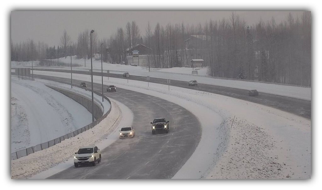 Today’s Alaska 511 camera view shows Eagle River Bridge with snow-packed shoulders and icy patches under partly cloudy skies—drive cautiously amid lingering March hazards. (Alaska 511)