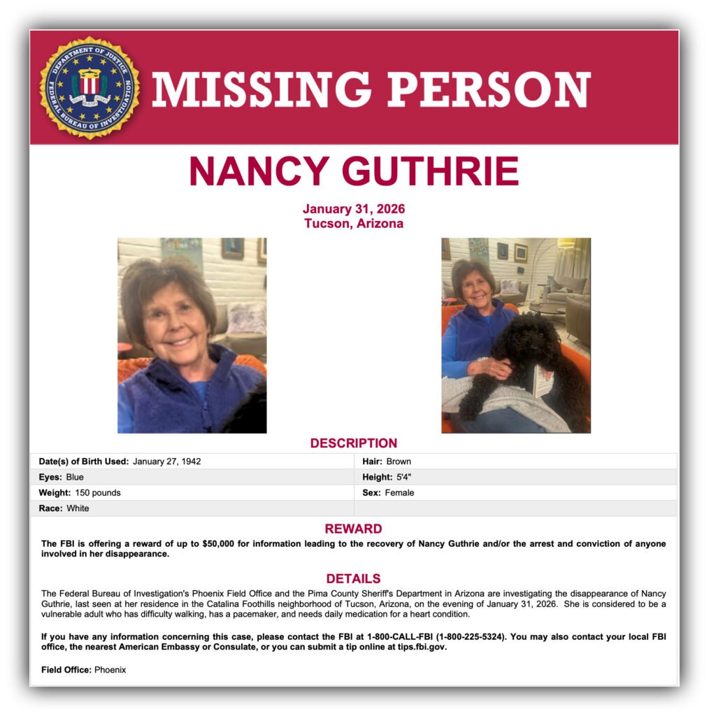 Notes demanding $4 million (first deadline February 5), then $6 million in Bitcoin (February 9), hit Arizona stations KGUN and KOLD plus TMZ, not the family, claiming Nancy was “safe but scared” and citing non-public details: Her Apple Watch placement, floodlights (front one on, two broken in back, Google Earth-visible), proving brief scene access. No negotiation channels, proof-of-life, or post-deadline contact emerged; FBI confirms no family communications, deeming them likely hoax or panicked improvisation.