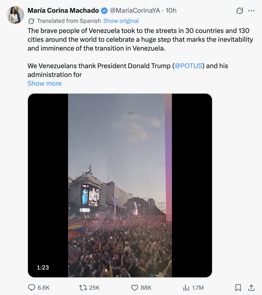 Opposition leader María Corina Machado said Venezuelans rallied in dozens of countries to mark what she called a decisive step toward political change. In a video posted online, she thanked President Trump and said Venezuela could emerge as a strategic partner of the United States on security, democracy, and energy.