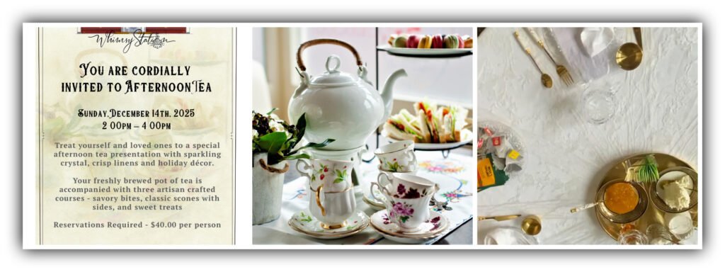 You are cordially invited to a special Afternoon Tea on Sunday, December 14th, 2025, from 2:00 PM to 4:00 PM at 16906 Old Glenn Hwy, Chugiak. Enjoy sparkling crystal, crisp linens, and holiday décor, paired with three artisan-crafted courses: savory bites, classic scones with sides, and sweet treats.