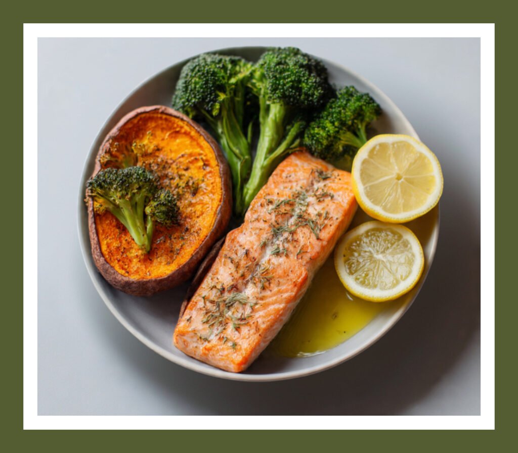 Enjoy a plate of baked salmon paired with a roasted sweet potato and steamed broccoli or other greens, drizzled with olive oil and a squeeze of lemon, seasoned with a touch of pepper. This simple, nutrient-rich meal delivers omega-3 fats, vitamins A and C, and protein to help support stronger, healthier hair.