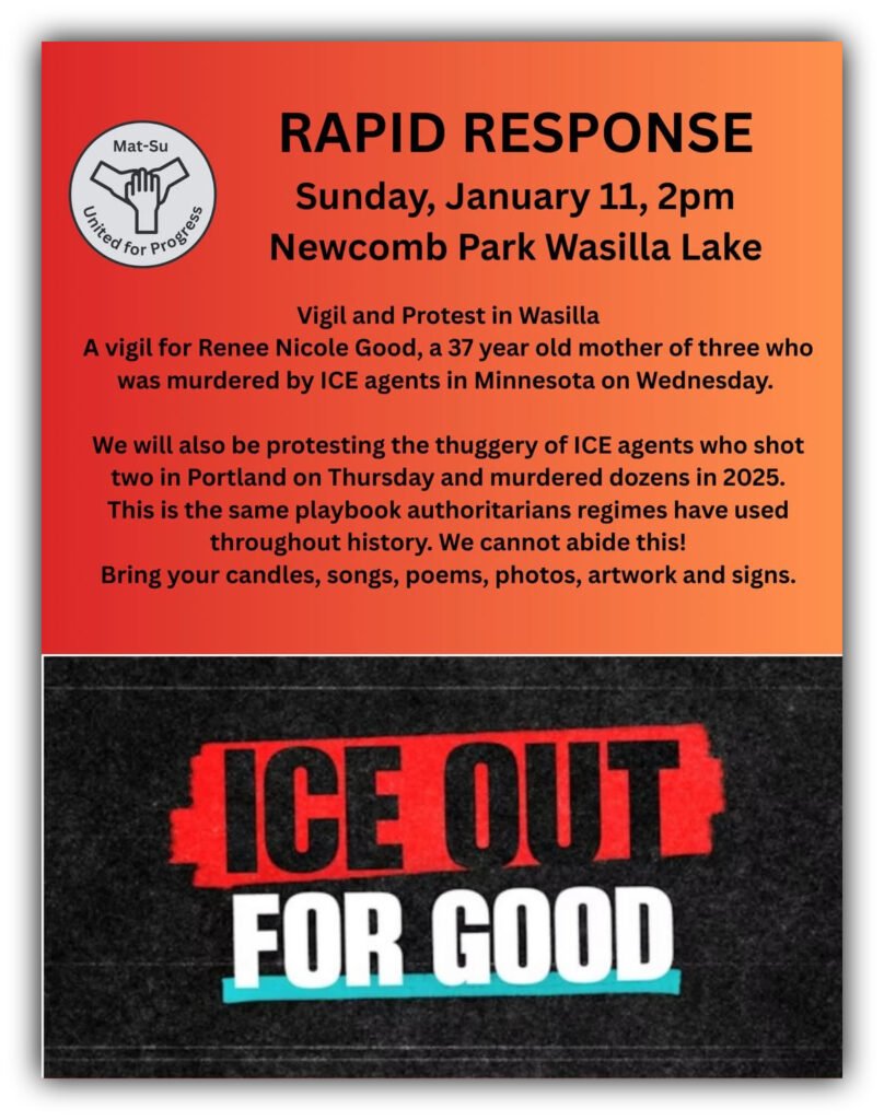 Mat-Su United for Progress is joining a broad coalition calling for accountability, remembrance, and visibility around the human cost of federal immigration enforcement. The Wasilla gathering invites people to bring candles, songs, poems, photos, artwork, and signs, with a clear commitment to nonviolence, lawful conduct, and de-escalation. No weapons of any kind are permitted, and events are to be held in public spaces. Participants are encouraged to register through Mat-Su United for Progress, which is coordinating communications and updates related to the action.