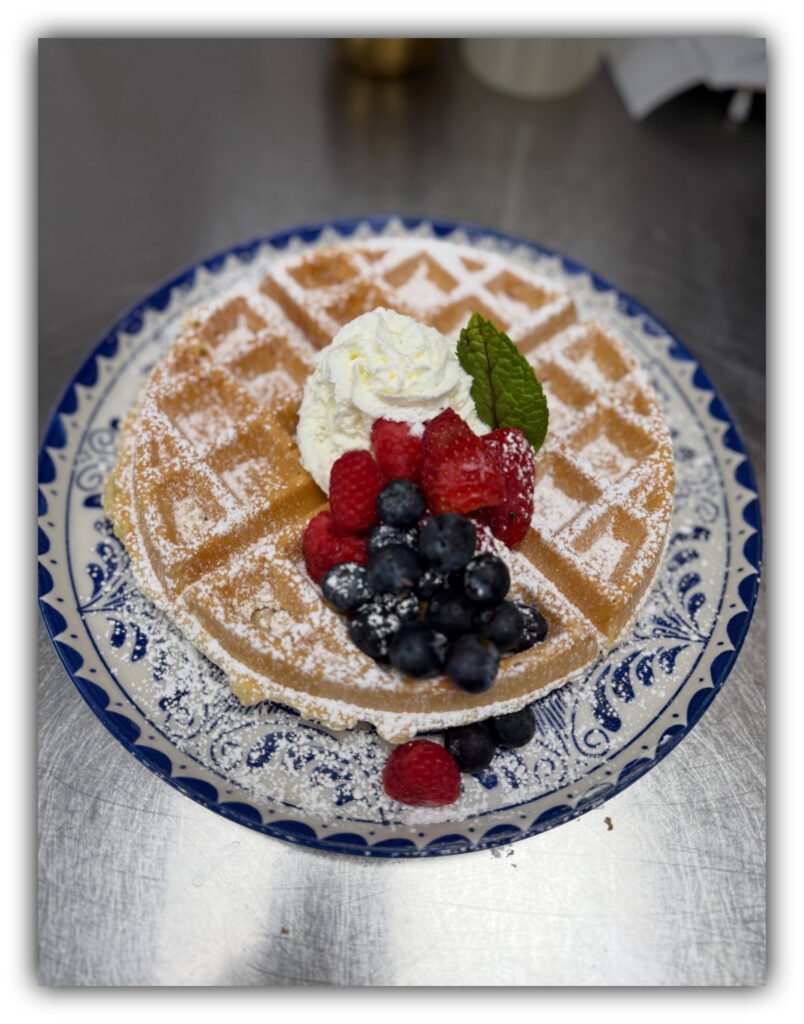 My husband, James, was a very happy customer, and his waffle deserves its own mention. He described it as the right amount of crispy and sweet. What stood out most was how well it held up under pressure. Even with fruit, syrup, butter, and whipped cream on top, it didn’t collapse or get soggy. It held its ground, exactly what you want when everything starts to stack up.