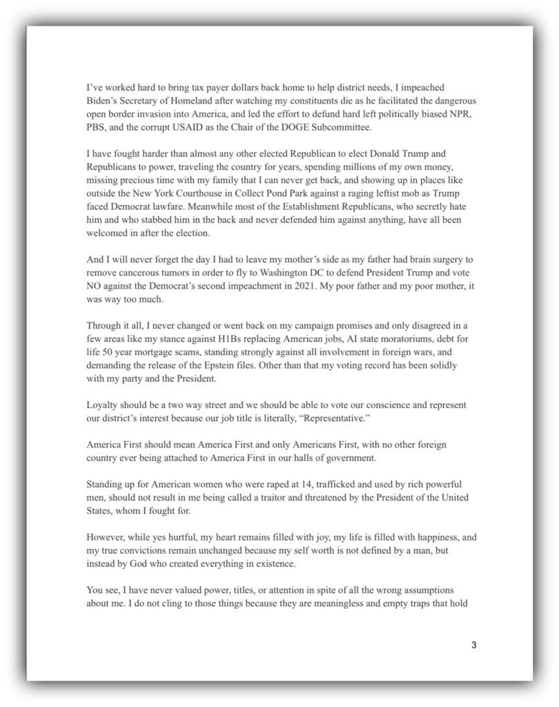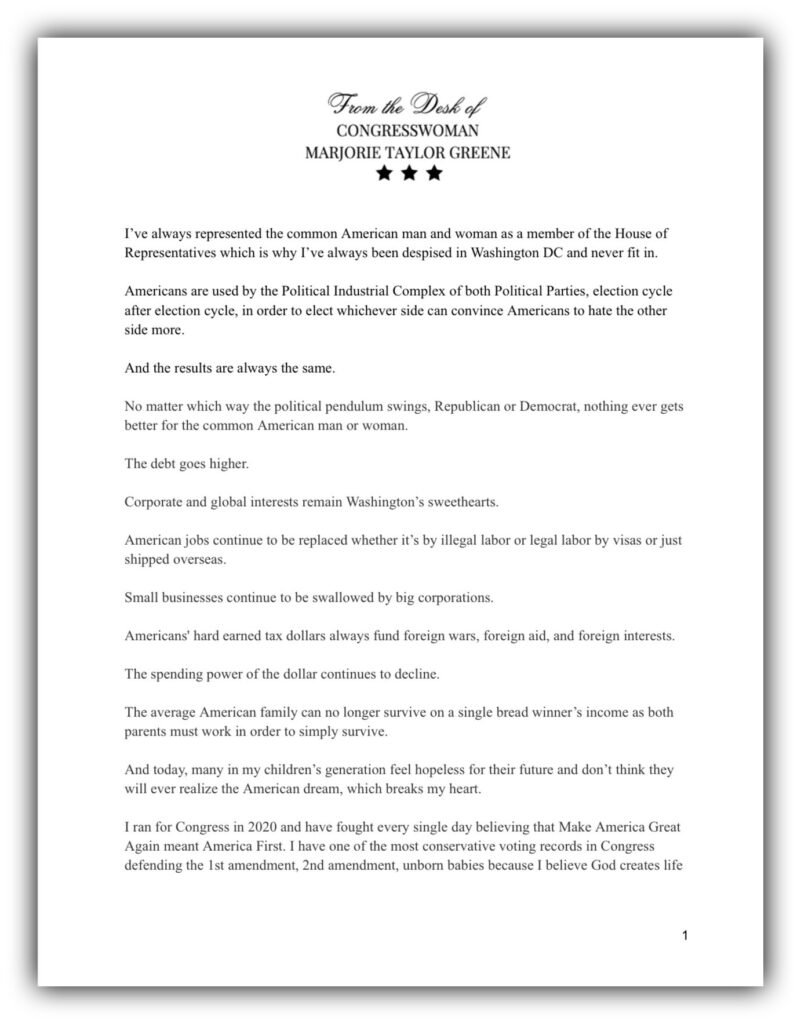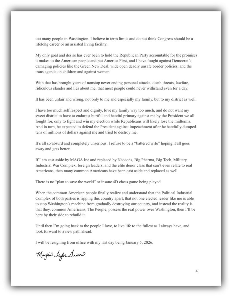 Marjorie Taylor Greene’s Resignation letter posted on X (formerly Twitter)
