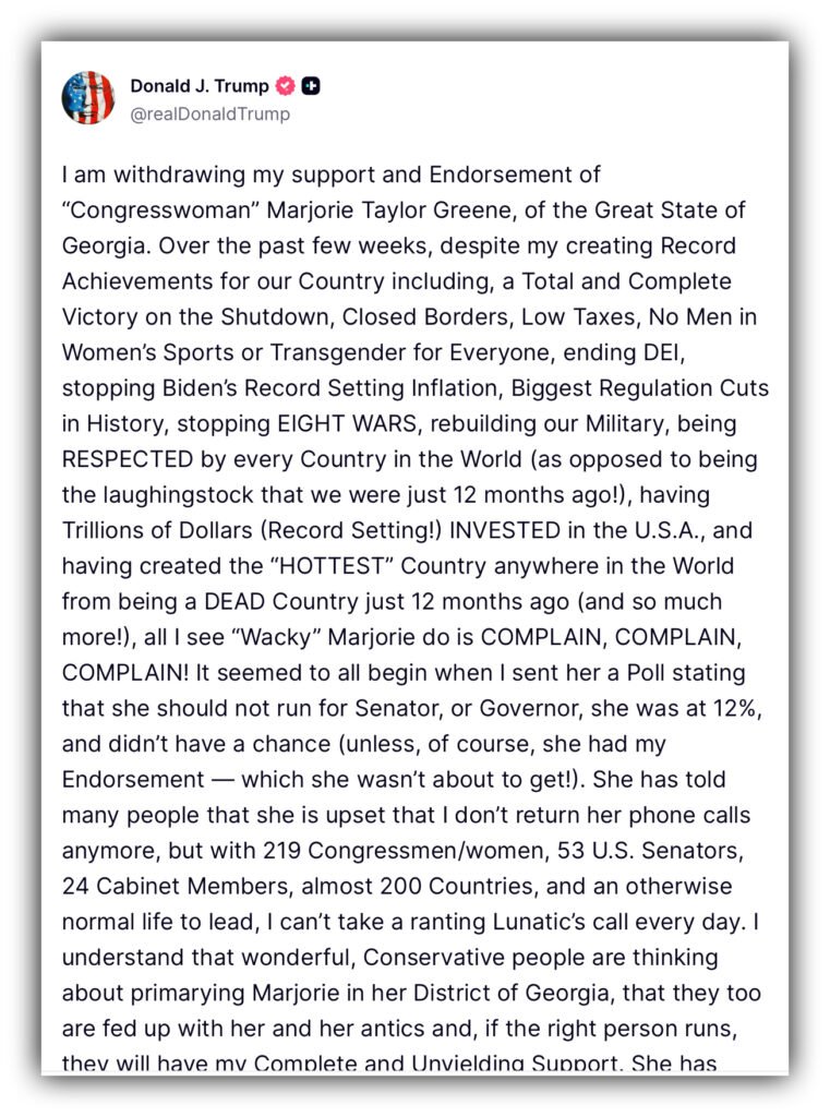 Trump Truth Social post withdrawing his support for Congresswoman Marjorie Taylor Greene, (R) Georgia
