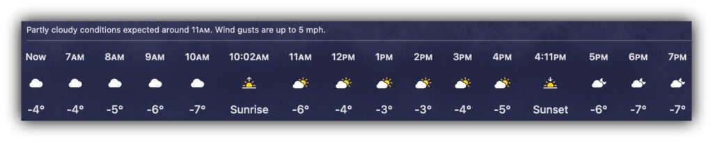 | Evening | -6F to -1F | Darkness and cold team up. Carry warm gear and give yourself extra time. |