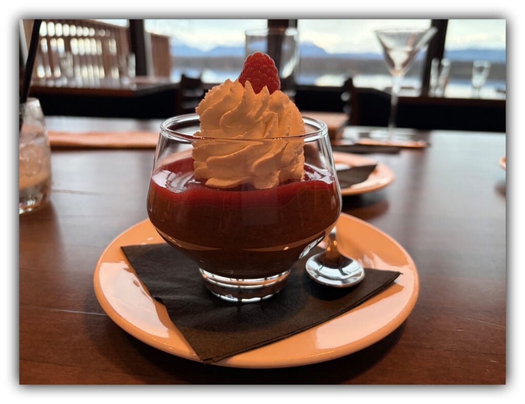 A dreamy chocolate mousse crowned with fresh raspberries and whipped cream, served at Chop House on Lucille Lake, Wasilla. Perfect treat for National Chocolate Mousse Day, April 3. 🍫🍓 Alaska Headline Living ©