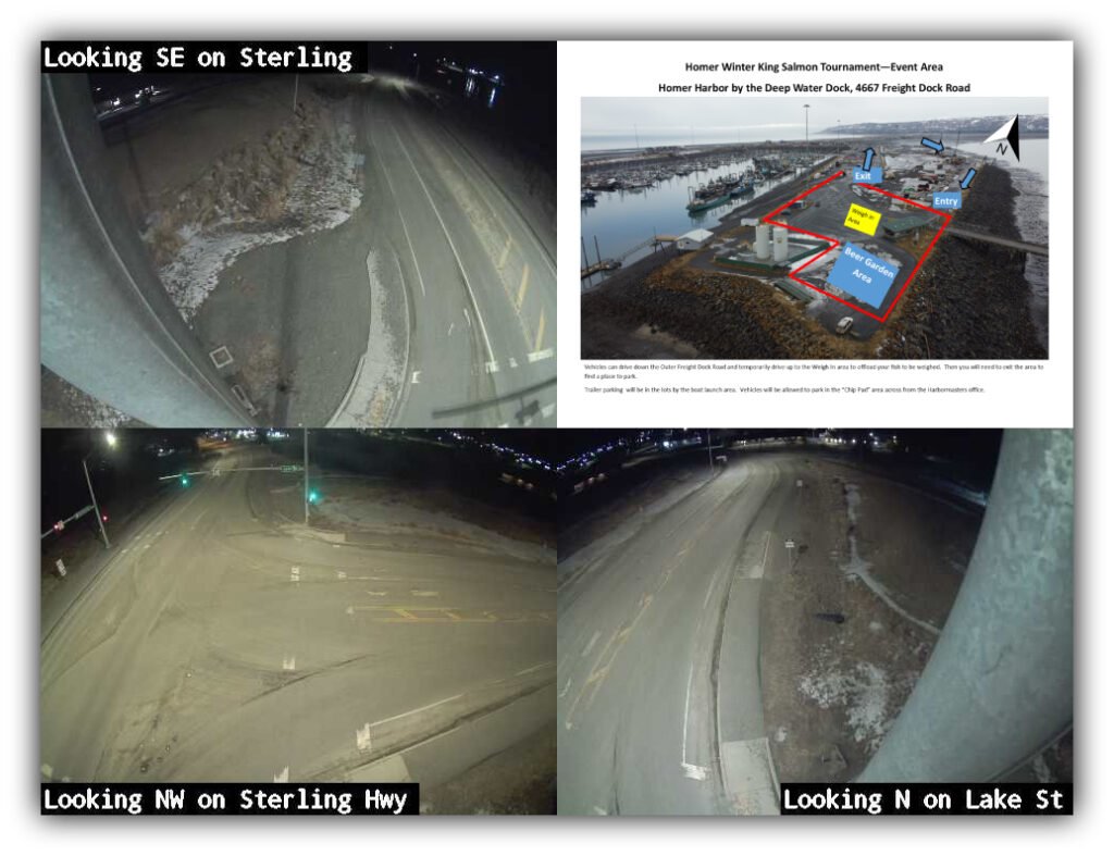 Sterling Hwy & Lake St | Alaska 511 | UPDATE: Anglers prepare for the 32nd Homer Winter King Salmon Tournament, now scheduled for Saturday, April 4, 2026, after two weather-related postponements caused by unusually cold temperatures that thickened harbor ice in Homer Harbor. The one-day competition in Kachemak Bay is one of Alaska’s most anticipated winter fishing events and awarded $198,526 in total cash prizes in 2025, when champion Zach Weimann earned $84,207 including side tournament winnings. Registration costs $150 per angler, with optional boat side tournaments available. Organizers delayed the event to allow harbor ice to clear and ensure safer conditions for anglers launching from the Deep Water Dock, where all prize fish will be weighed and inspected. Courtesy Homer Chamber of Commerce and Visitor Center.