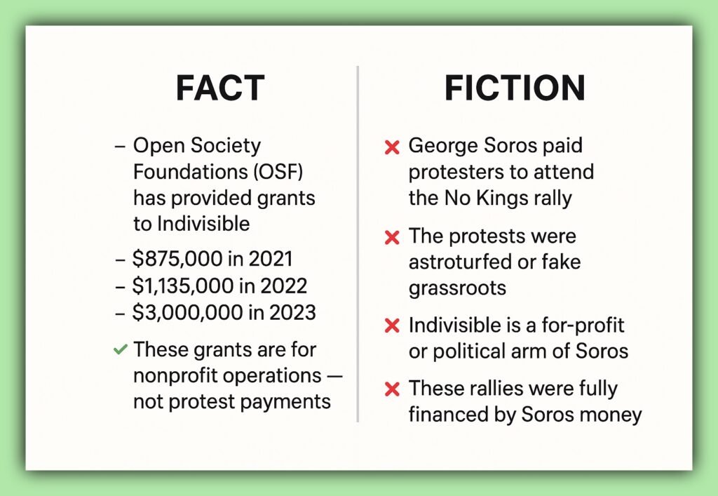 • Fiction: There is no evidence that Soros paid individual protesters to attend the No Kings rallies.