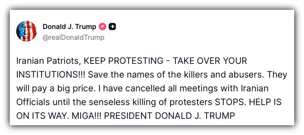 Across the globe, Iran’s deepening economic woes have ignited protests that have grown increasingly deadly, with human rights monitors reporting that at least 2,000 people have been killed since demonstrations began. In a major White House development today, President Donald Trump used his Truth Social platform to urge Iranian protesters to “keep protesting” and vowed that “help is on the way,” although he did not specify exactly what form that help will take.