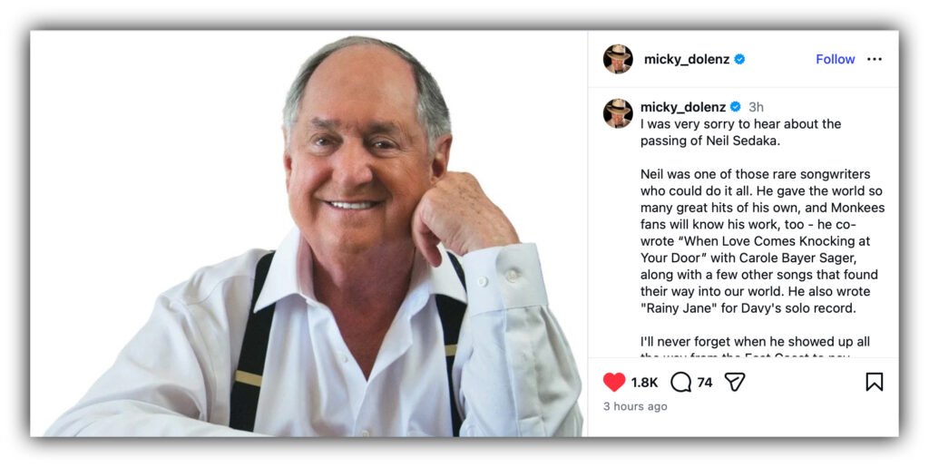 In an Instagram post, a screenshot of which is included below, Dolenz reflected on Sedaka’s songwriting talent and personal kindness.