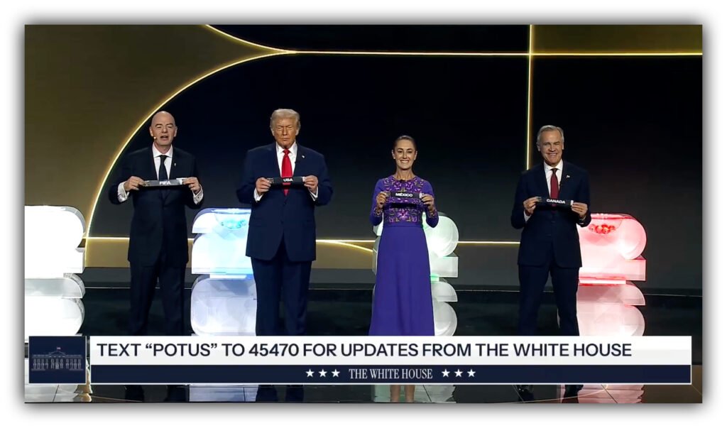President Trump, alongside the Presidents of Mexico and Canada and a FIFA representative, holds up their selections during the live 2026 FIFA World Cup draw ceremony at the John F. Kennedy Center in Washington, D.C. (Photo courtesy: The White House)