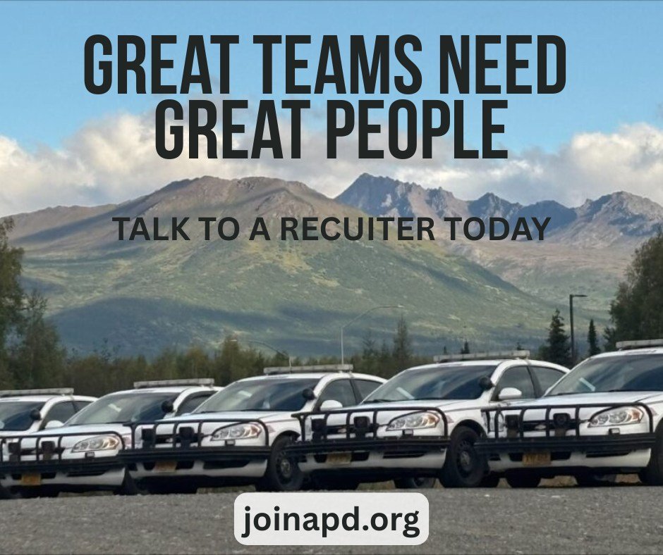 The Anchorage Police Department is looking for officers to start at $41.06 per hour with great benefits, training, and opportunities to grow. Applications are open through January 31, 2026. Text a recruiter at (907) 444‑3560 or visit 3760 West Dimond Blvd to learn more. Apply online at joinapd.org.