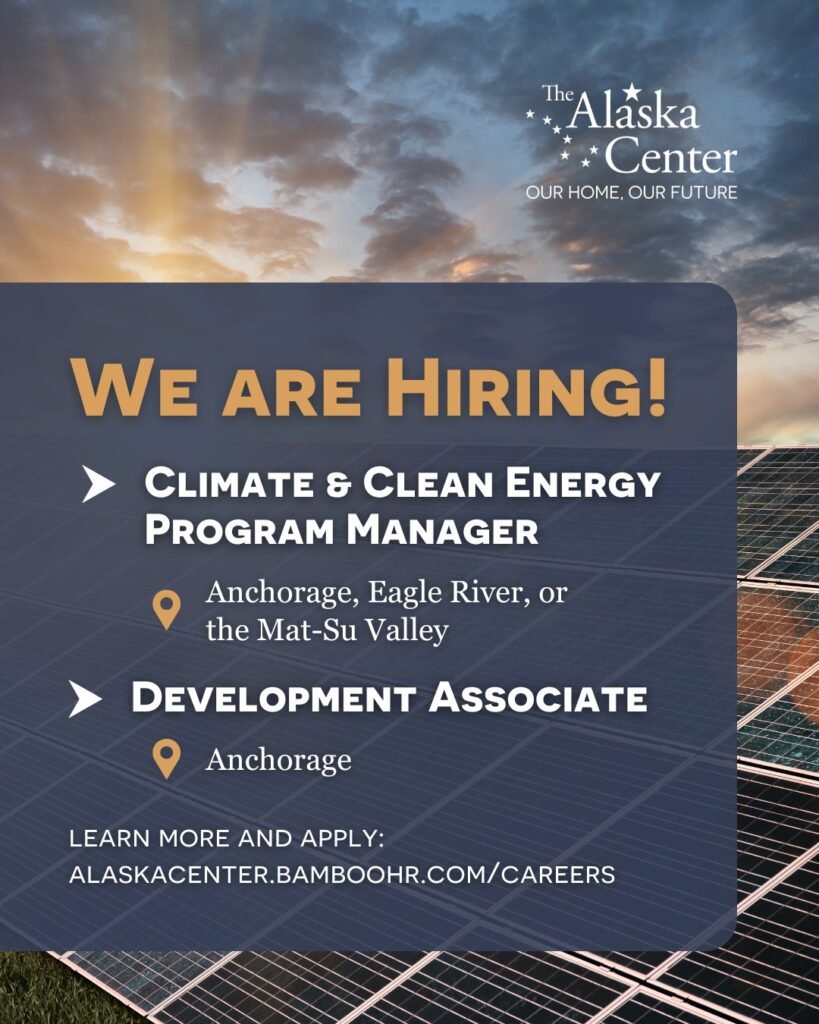 The Alaska Center is hiring for Climate and Clean Energy Program Manager ($60,000‑$65,000 DOE) and Development Associate ($25.80‑$28/hr) roles, both with competitive benefits. These positions focus on advocacy, clean energy, and community engagement in Anchorage, Eagle River, or the Mat-Su Valley.