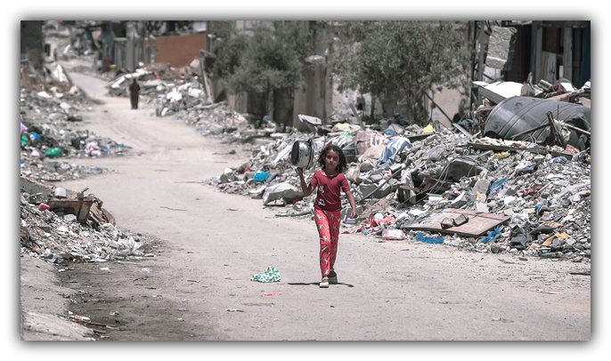 Gaza girl braves sniper fire for food in starvation war. Tiny figure scavenges rubble alone amid 67,000+ dead. Child casualties mount alongside 400k displaced in endless agony and struggle. (Jaber Jehad Badwan, Aug 25, 2024; Wikimedia CC BY-SA 4.0)