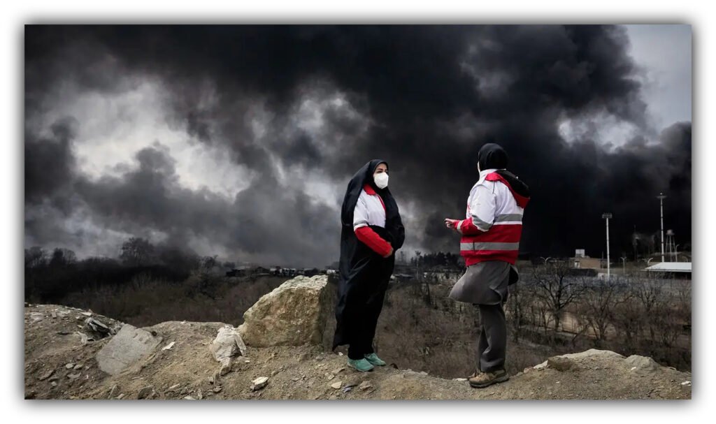 Days later, Tehran’s oil depots erupted in flames from follow-up hits, spewing thick crude smoke that birthed black acid rain. Oily, corrosive downpours coating streets in toxic sludge. Women, already reeling from loss and alerts to stay inside, faced suffocating homes-turned-prisons. Prolonged lockdown amid shortages and panic unleashes beatings on wives, mothers and children, domestic violence surging as men snap under visible poisoned air and grief.