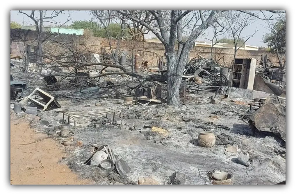 Incendiary damage scars Imam al-Kazem school, El Geneina IDP haven. RSF militias torched this Massalit shelter on April 25, 2023 amid ethnic cleansing that left thousands dead and half a million displaced. © 2023 Roots for Human Rights and Monitoring Violations.