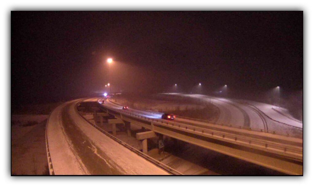 Morning1810Snow packed lanes and slick shoulders. Reduce speed and increase following distance.High