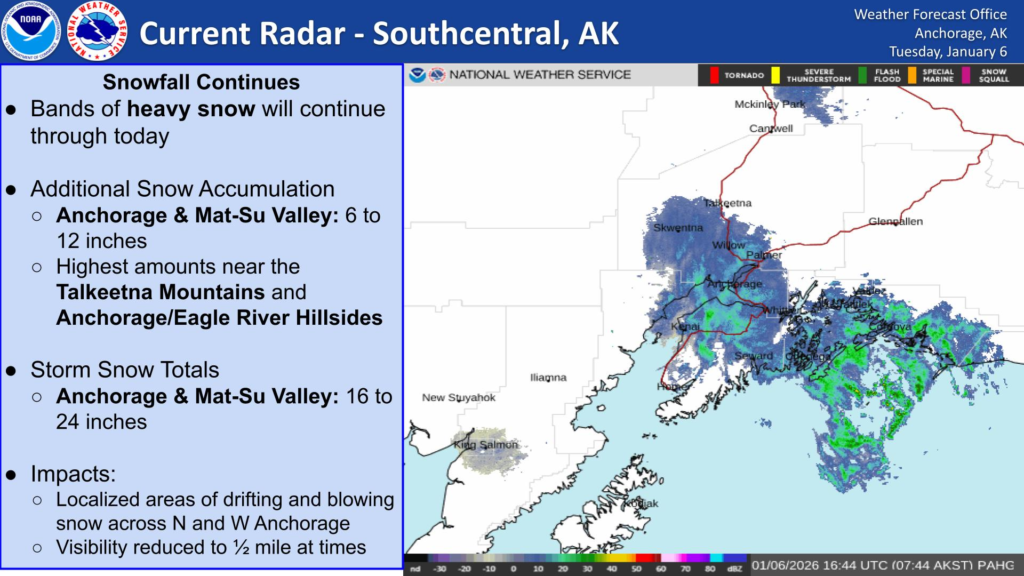 Southcentral Alaska is squarely in the path of a major winter storm, and the National Weather Service is keeping winter weather advisories and warnings active for Anchorage, the Mat‑Su Valley, Eagle River, and surrounding lowlands. Snowfall continues this afternoon, with bands of moderate to heavy snow reducing visibility and causing slippery roads. These snow bands are expected to persist into tonight before tapering briefly, then returning Tuesday into Wednesday as the Arctic air mass tightens its grip.