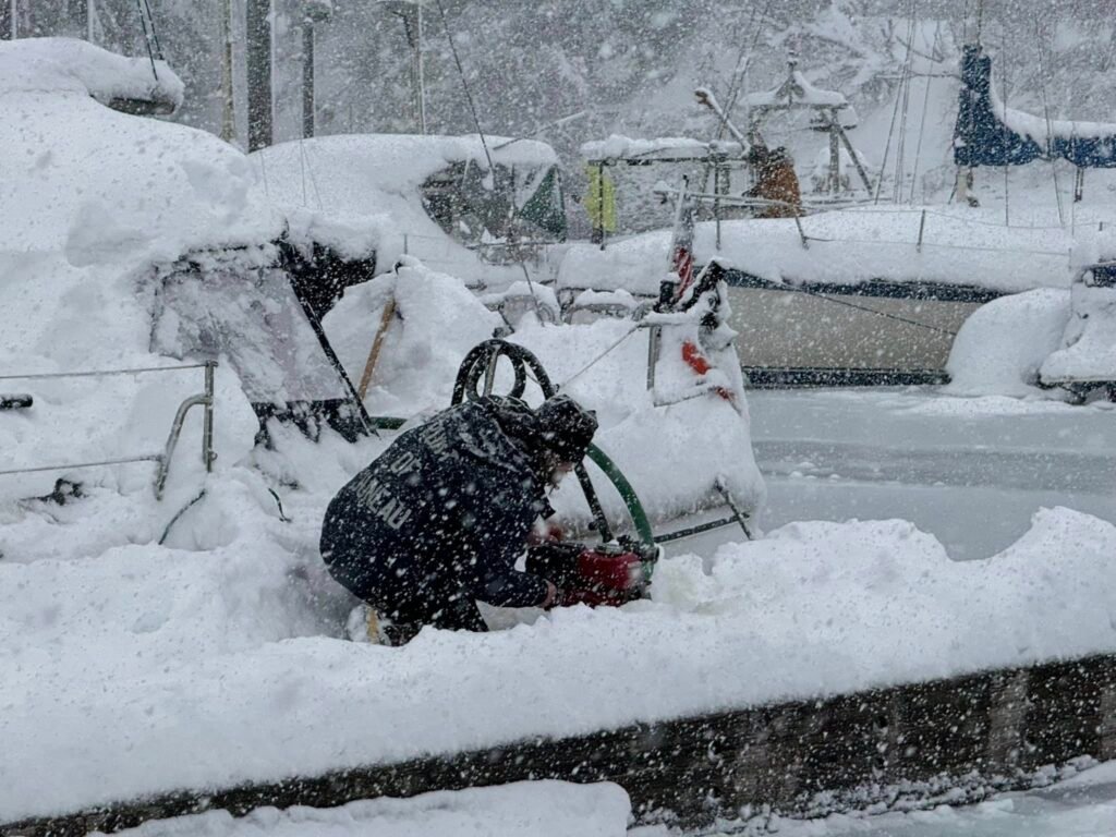This prolonged pattern follows an exceptionally snowy December, with persistent cold air keeping precipitation locked in as snow instead of rain. Heavy, wet snow continues to pile onto docks, roofs, and vessel decks, creating structural stress across the waterfront.