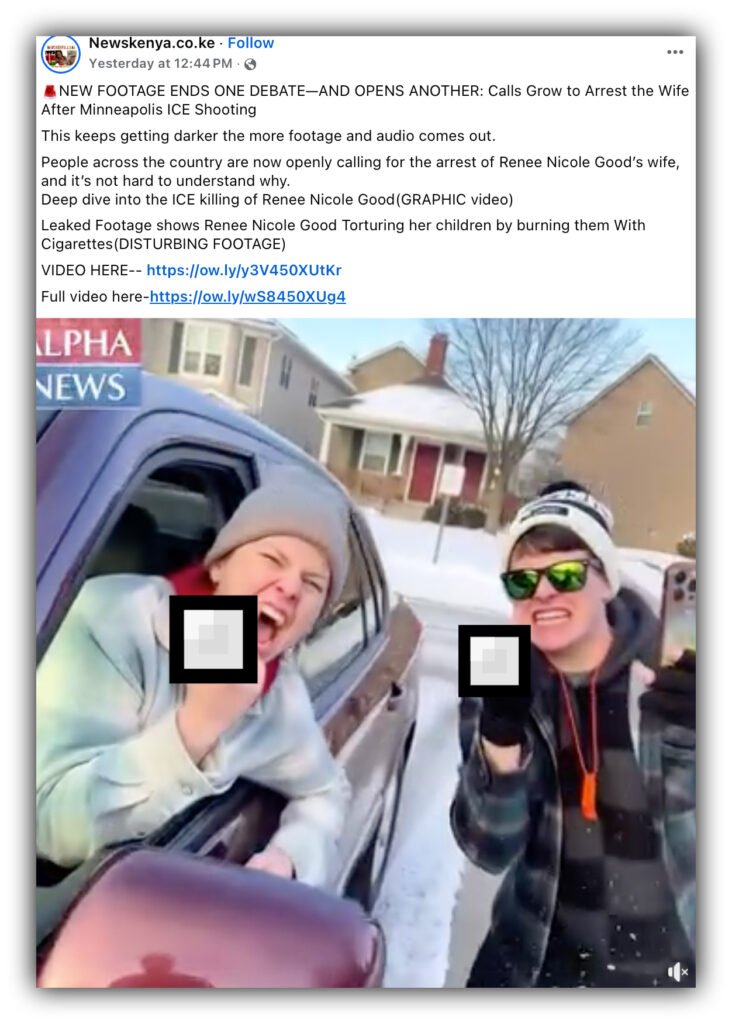 A viral Facebook reel from the Kenyan account Newskenya.co.ke raised serious red flags this week. The post promoted supposed “leaked footage” and graphic claims alleging child torture connected to the Minneapolis ICE shooting victim Renee Nicole Good and her wife.