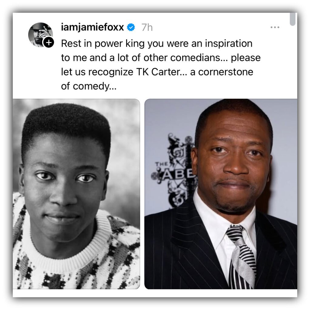 Jamie Foxx’s Threads tribute to comedian and actor TK Carter, celebrating Carter’s career and influence on comedy and shared through a series of career photos. (Original post from @iamjamiefoxx on Threads)