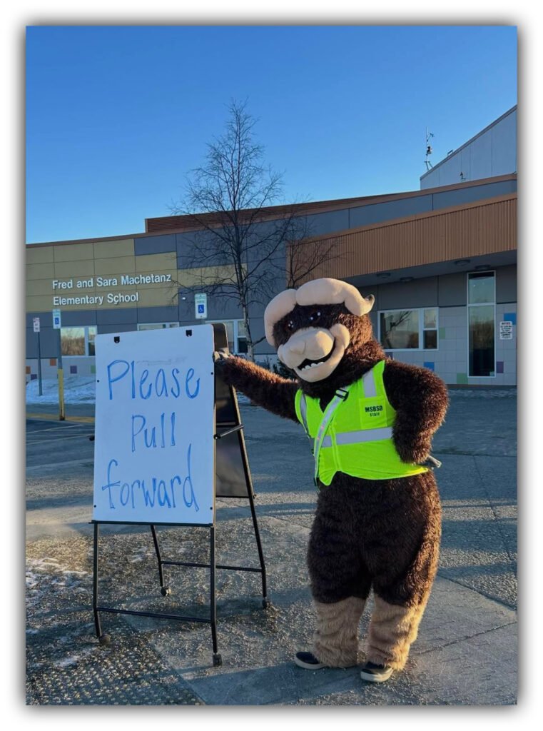 The district thanked families for working together to keep drop-off and pick-up running smoothly, including at Machetanz Elementary School. An update on transportation is expected during spring break, with service planned to resume March 16.